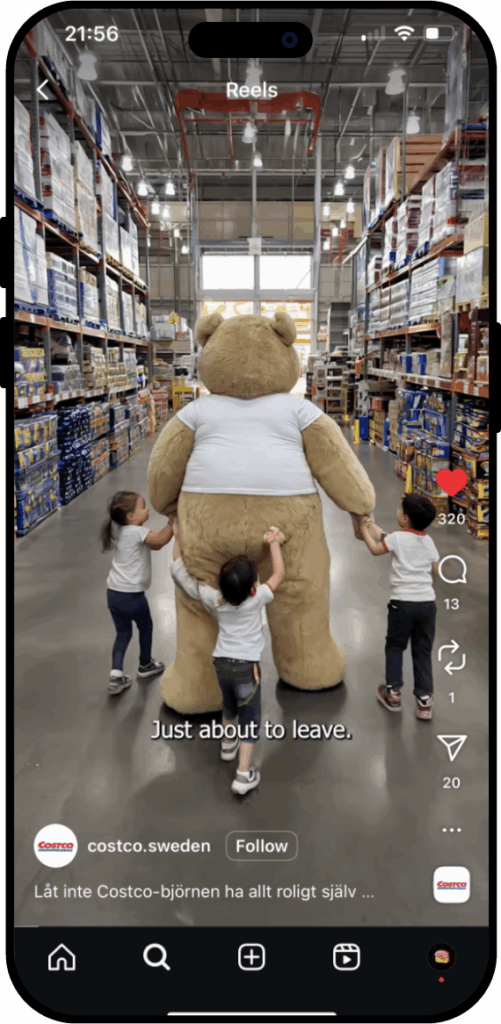 Through a flexible AI-driven pipeline, we produced a four-part digital series following the Bear’s adventures across Malmö, from fueling up to exploring Costco aisles and grabbing pizza at the food court.